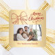 Un arrière - plan fax à l'apparence or, du texte rouge et un arc rouge dessiné à la main. Texte et photo. Joyeux Noël est écrit avec une élégante police de style manuscrite.