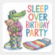 Illustration aquarelle d'un alligator en pyjama patchwork debout, tenant un ours en peluche habillé d'une tenue patchwork. L'alligator est sur un arrière - plan blanc. Il y a un texte qui dit "Sleepover Birthday party" dans la typographie colorée. Il y a un sac de couchage et un coussin.