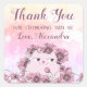 Chat rose mignon aux fleurs violettes merci autocollant pour la fête d'anniversaire de la petite fille.