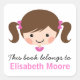 stickers sympa et amusant à la bibliothèque / étiquettes de livres pour les enfants avec une petite fille de dessin animé avec les cheveux bruns attachés dans les porcelets. Texte personnalisable "ce livre appartient à". Personnalisez le nom. Conception mignonne pour l'étiquetage des livres pour enfants.