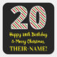 Ce sticker simple et amusant sur le thème de Noël et d'anniversaire Décembre 25th avec un grand numéro "20" avec un motif rayé rouge, blanc et vert, avec le message "Joyeux 20th Birthday & Joyeux Noël", et un nom personnalisable. L'arrière - plan est noir de couleur. Des autocollants comme celui-ci peuvent être amusants à utiliser pour préparer des cadeaux ou des cadeaux qui sont donnés à quelqu'un qui est né le 25 décembre (jour de Noël) et qui célèbre son vingtième anniversaire. [~Z0000409]