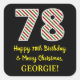 Ce sticker fun et simple thème de Noël et thème d'anniversaire Décembre 25ème anniversaire de conception comporte un grand numéro "78" avec un motif rayures rouge/blanc/vert, avec le message "Happy 78th Birthday & Joyeux Noël", et un nom modifiable. L'arrière - plan est noir de couleur. Des autocollants comme celui-ci pourraient être une façon amusante de préparer des cadeaux qui sont donnés à quelqu'un qui est né le jour de Noël (le 25 décembre) et qui célèbre son soixante-dix-huitième anniversaire. [~Z0000409]