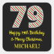 Ce sticker simple et amusant sur le thème de Noël et d'anniversaire Décembre 25th avec un grand numéro "79" avec un motif à rayures verte, blanche et rouge, avec le message "Happy 79th Birthday & Joyeux Noël", et un nom personnalisable. L'arrière - plan est noir de couleur. Des autocollants comme celui-ci peuvent être amusants à utiliser pour préparer des cadeaux qui sont donnés à quelqu'un qui est né le jour de Noël (le 25 décembre) et qui célèbre son soixante-dix-neuvième anniversaire. [~Z0000409]
