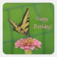 Cet autocollant d'anniversaire heureux présente un joli papillon qui ramasse le nectar d'une zinnie rose dans un jardin du Connecticut.