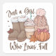 Confortable design automne avec des bottes moelleuses, une beanie tricotée, une boisson citrouille aux épices, un citrouille à ruban et des feuilles en chute, avec l'expression "Just a Girl Who Loves Fall" en lettres chaudes et manuscrites. Parfait pour célébrer les ondes d'automne.