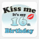 Beau autocollant avec le texte : "embrassez-moi, c'est mon 16e anniversaire. Un baiser est représenté avec un rouge rouge rouge rouge rouge à lèvres." Les couleurs sont noires et bleues. C'est sympa de donner un cadeau à quelqu'un qui a 16 ans, ou à vous-même pour montrer que vous êtes un anniversaire