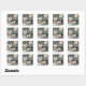 Des autocollants de Noël. Une aquarelle d'art sucré d'un petit chaton blanc endormi sur une couverture sur les marches d'un porche avant d'une ancienne ferme rustique.