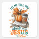 Design paisible et coloré avec une scène automne / automne avec un livre ouvert, citrouille et café. Le texte inspirant et coloré dit : "Laissez-moi vous parler de mon Jésus". Ce design est disponible sur une grande variété de produits.