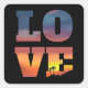 Une plage tropicale est le cadre idéal pour l'amour ! Belles étiquettes d'effet texte de knockout avec des lettres empilées du mot LOVE. Une scène de coucher de soleil tropical colorée avec des palmiers en silhouette se déroule à travers les lettres de blocs sur arrière - plan noir.