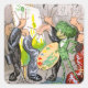 Illustration drôle de Theodor Kittelsen de sa série de couleurs d'eau intitulée "Har Dyrene Sjæ l?" (Do Animals have Souls?), publiée en 1893. Cette illustration est intitulée "Brilliant !" Une grenouille avec une mop de cheveux verts tenant une palette de couleurs de peinture regarde fièrement son tableau sur un chevalet, tandis que des limaces en costume admirent son travail.