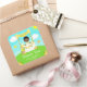 Ce sticker mignon et capricieux présente un fils à cheveux noirs avec peau foncée sur un stand de limonade jaune qui est décoré de fleurs et de bunting. Dans l'arrière - plan est un ciel bleu, soleil et papillons. Le texte combine les polices décoratives et sans serif pour un look élégant et moderne. C'est parfait pour un anniversaire d'été. Graphiques de MUJKA