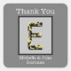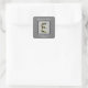 Personnalisez votre mariage merci cartes ou sacs de faveur avec cette élégante lettre E monogramme. Le grand E initial présente des couleurs d'or et de noir dans un style antique vintage. Cette lettre apparaît dans un carré gris clair, en noir. Les mots "merci" ainsi que les noms de la mariée et du marié apparaissent autour du monogramme. Changez rapidement et facilement les mots d'appréciation et les noms.