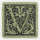 Charmant lettre décorative V monogramme initial style de calligraphie typographie première lettre en noir sur vintage vert sauge - avocado doublure de livre vert avec blanc cassé feuilles de Ginkgo biloba.