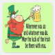 Cet autocollant du jour de la Saint Patrick comporte un leprechaun tenant une tasse de bière et le dicton "Où que vous alliez, et quoi que vous fassiez, que la chance des Irlandais soit avec vous."