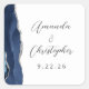 Ces autocollants de mariage élégants et modernes présentent un design aquarelle bleu nuit rehaussé de faux strass argentés. Personnalisez facilement le texte gris charbon sur fond blanc, avec les noms des mariés dans une calligraphie manuscrite élégante et la date dans une police sans serif.