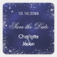Un autocollant Enregistrer la date pour votre mariage. Un arrière - plan bleu marine, texte blanc. La couleur bleue est inégale. Décoré de faux éclats d'argent. Personnalisez et ajoutez vos noms et votre date de mariage.