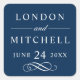 Ajoutez une touche finale élégante à vos cadeaux de mariage avec cet autocollant carré monogramme classique bleu nuit. Les noms des mariés et la date du mariage sont affichés dans une typographie blanche raffinée avec des accents de défilement décoratifs sur un fond bleu nuit riche. Idéal pour les sacs de cadeaux, les boîtes à cadeaux, les bouteilles de vin ou les sceaux d'enveloppe. Tout le texte est entièrement personnalisable. Coordonne avec la suite de mariage Classique Élégant Bleu Nuit.