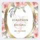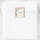 Floral aquarelle mariage autocollant carré dispose de belles fleurs roses douces avec verdure et un cadre élégant doré. Il indique la date et le nom de la mariée et du marié.