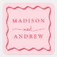 Scellez vos enveloppes et faveurs mariages avec des autocollants Modern Pink and Red Wavy Frame personnalisés ! Le design présente les noms du couple en lettres rouges gras entourés d'un cadre ondulé rouge qui contraste avec un arrière - plan rose. Les autocollants de mariage rétro ont été conçus pour être coordonnés avec notre collection de mariages Wavy Frame Moderne.