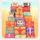 Une énorme pile de cadeaux d'anniversaire colorés gardés par des chats curieux et ludiques.