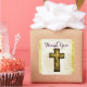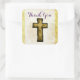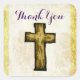 Un autocollant avec une croix en bois dans les tons brun foncé autour de la frontière lui donnant un aspect brûlé tandis que le reste de la croix est un brun doré avec des lignes et des gravures dans le bois. Le texte dit merci dans une police foncée violet fantaisie. L'arrière - plan est une texture avec un look de parchemin fané en blanc doux et marron avec une bordure dorée.