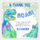 Autocollant dinosaure aquarelle coloré T rex et stégosaure merci, idéal pour les fêtes d'anniversaire des garçons, en particulier les célébrations sur le thème de la jungle jurassique. Va parfaitement avec les sacs de faveur. Les mots « Un rugissement de remerciement ! pour dire merci d'avoir célébré mon anniversaire avec moi » avec un nom d'enfant personnalisé. Typographie bleue moderne et amusante facile à personnaliser à l'aide du modèle. Œuvre originale de l'artiste Catherine Sweetman