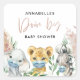 Mignonne sexe inconnu animaux de baby shower dans les masques covid baby shower virtuel. Feuillage botanique de fleurs blanches et éléphant, lion et zèbre dans les masques faciaux. Texte de script, partie d'une collection disponible en différentes couleurs.