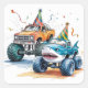 Une aquarelle vibrante illustrant le bac d’anniversaire d’un garçon avec deux camions monstres passionnants. Un camion est un modèle classique avec des pneus surdimensionnés, tandis que l'autre est un camion sur le thème du requin féroce avec des dents sortant du grill. L'arrière - plan est blanc pur, mettant en évidence les coups de pinceau doux et l'effet d'aquarelle artistique. Parfait pour les décorations de fête d'anniversaire, les invitations ou les imprimés thématiques.