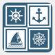 Design à thème nautique avec voilier, voilier, boussole et décoration d'ancre en carré rayé blanc et bleu