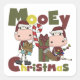 Deux vaches dans des casquettes de bas, des cadeaux de Noël, des lumières de vacances, des sucres de canne, et texte rouges qui lit "Noël de Mooey" sur le T-shirts de vacances, les tasses, les cartes, les autocollants, les sacs fourre-tout, les horloges murales, les boîtes de souvenir, les ornements, les porte - clés, et d'autres habillement et cadeaux mignons de vacances de thème de vache.