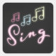 Le mot SING et trois notes de musique se positionnent en néon contre un arrière - plan mur en béton noir.