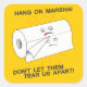 Un rouleau de serviettes en papier avec la feuille de fond déchirée dans un coin. La serviette en papier sur le dessus dit "Accrochez-vous à Marsha ! Ne les laissez pas nous déchirer !" Chaque feuille a des yeux et une bouche.