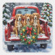 Celebrate the holiday season with this energetic and beautiful Nova Scotia Duck Tolling Retriever Christmas design! This cheerful scene features three bright, reddish-gold Tollers sitting happily in the back of a classic red pickup truck, nestled in a picturesque snowy winter forest. The vintage truck is adorned with a vibrant Christmas wreath, twinkling with red and gold ornaments and warm, glowing lights. Soft snowflakes gently fall, enhancing the winter wonderland effect. A decorated Christmas tree in the background completes this heartwarming picture, making it an ideal Christmas gift for any Toller owner, dog lover, or admirer of festive and active dog breeds. This design perfectly captures the joyful spirit of the holidays.