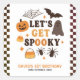 Halloween anniversaire thématique "Let's Get Éffrayant" avec chauves-souris volantes, citrouilles souriants, araignées, toiles d'araignée et fantôme d'Halloween dans les couleurs orange et marron. Parfait pour une soirée anniversaire de enfant à thème Halloween éffrayante mais mignonne.