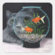 Un beau chat aux cheveux longs gris bleu russe regarde dans un bol rond de poisson rouge avec un oeil et un visage magnifiés. Le poisson rouge a l'air surpris en nageant au-dessus des nombreux petits galets colorés.