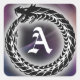 Ouroboros symbolique noir - le dragon mordant sa propre queue - représentant le passage des saisons, le renouveau et la renaissance. Le dragon est représenté sur un arrière - plan mystique violet et bleu et a une lueur magique blanche. Comprend une lettre monogramme personnalisable dans le style gothique Vieille police anglaise au centre.