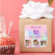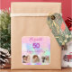 Pour une fête d'anniversaire de 50e (ou tout âge). Un collage de 3 de vos photos d'elle-même, d'amis, de famille, d'intérêts ou d'animaux de compagnie. Un arc-en-ciel féminin, arrière - plan de couleur holographique en violet, rose, or rose et vert menthe. Décoré avec des gouttes de parties scintillant, la peinture goutte à goutte. Personnalisez et ajoutez son nom et son âge de 50 ans. Le texte : joyeux anniversaire est écrit avec un script de style à la main tendance avec des swashes. Texte de couleur violette.
