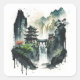 Un bel ensemble d'autocollants carrés montrant une illustration à l'encre d'un paysage à l'architecture chinoise ancienne et de cascades majestueuses.