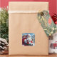 Un Père Noël classique et joyeux debout dans un paysage hivernal enneigé, tenant un sac de cadeaux festif à côté d'une maison confortable et lumineuse. Charme chaud des fêtes parfait.
