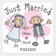 Joli couple en bâton joyeux avec les coeurs roses dans l'arrière - plan. La mariée porte une robe mariage et le marié porte un smoking avec cravate arc. Le texte dit JUST MARRIED. Customisez-le avec votre date de mariage ou ce que vous voulez. Parfait pour votre lune de miel. PinkInkArt original !