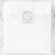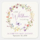 Élégant sticker pour bébé fille crème légère pour vos invitations, faveurs de fête et cartes de remerciement avec "un petit fleur sauvage est en route" dans la typographie gris moderne et un script élégant lavande, une couronne d'aquarelle d'inspiration boho de fleurs sauvages violet, rose, pêche et jaune, et un papillon violet. Personnalisez le nom et la date de la douche de la mère en lavande simple et en typographie grise.