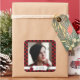 Utilisez des autocollants photo au lieu des étiquettes cadeaux ! Quelle façon unique et amoureuse de célébrer Noël et de donner des cadeaux cette saison! Téléchargez simplement votre photo et ajoutez simplement votre salutation. Chèque noir sur arrière - plan rouge vif, cadre brun foncé autour du modèle photo et étiquette blanc en bas pour ajouter votre salutation. Verdure et fleur rouge à gauche du étiquette blanc.