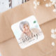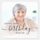 Autocollants modernes de fête d'anniversaire avec une photo personnalisée. Remplacez facilement l'exemple d'image par une photo de l'invité d'honneur. Le mot "anniversaire" apparaît dans un élégant script d'écriture manuscrite noire. Personnalisez le texte avec le nom et l'année d'anniversaire en noir sans serif police. Une superposition de dégradé blanc aide à faire apparaître le texte.