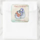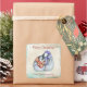 Un joli autocollant de Noël personnalisé avec votre nom et Joyeux Noël. Conçu avec une adorable illustration d'un couple de pingouins se tenant ensemble. Portant des écharpes d'hiver et des casquettes. Placé sur un arrière - plan vintage couleur crème aux accents turquoise le long des bords.