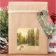 stickers de Noël avec une belle photo nature. Un chemin hivernal isolé avec de grands pins enneigés. Une teinte dorée créera une sensation magique à cette photo.