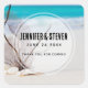Mariage merci autocollants avec une magnifique photo. Eau bleue tropicale et surf mousse dans l'arrière - plan. Une collection de coquillages et de tiges s'étend sur une plage de sable blanc.