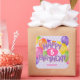 Ces autocollants d'anniversaire amusants et colorés comportent le message "Joyeux anniversaire", épelé dans des biscuits découpés réalistes, violets et gelés entourés de ballons multicolores et de drapeaux de bunting - l'âge et le nom de l'enfant peuvent être personnalisés - l'arrière - plan est un motif de petits pois blancs sur un arrière - plan violet clair - par katz_d_zynes