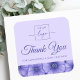 Square business thank you stickers featuring your custom logo and the text "Thank you” in an elegant script font with customizable text below. Along the bottom edge edge is a purple flower pattern border.