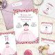 Une jolie robe de soirée rose sur une forme de robe est affichée parmi les bouquets de jolies fleurs d'aquarelle rose sur le dessus et le bas de cet autocollant Quinceañera. Des étoiles roses pointent l'arrière - plan tandis que l'arrière - plan a un motif étoile rose correspondant. Idéal pour utiliser les faveurs pour la fête de la fille d'anniversaire. Disponible avec des produits correspondants.