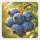 Ripe blueberries hang from a branch, adorned with dewdrops, while the sunlight casts a warm glow around their vibrant blue hue
